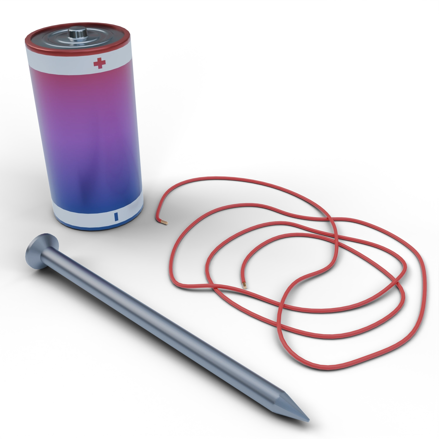 Die Bauteile für einen einfachen Elektromagneten: Batterie, Draht und ein Nagel