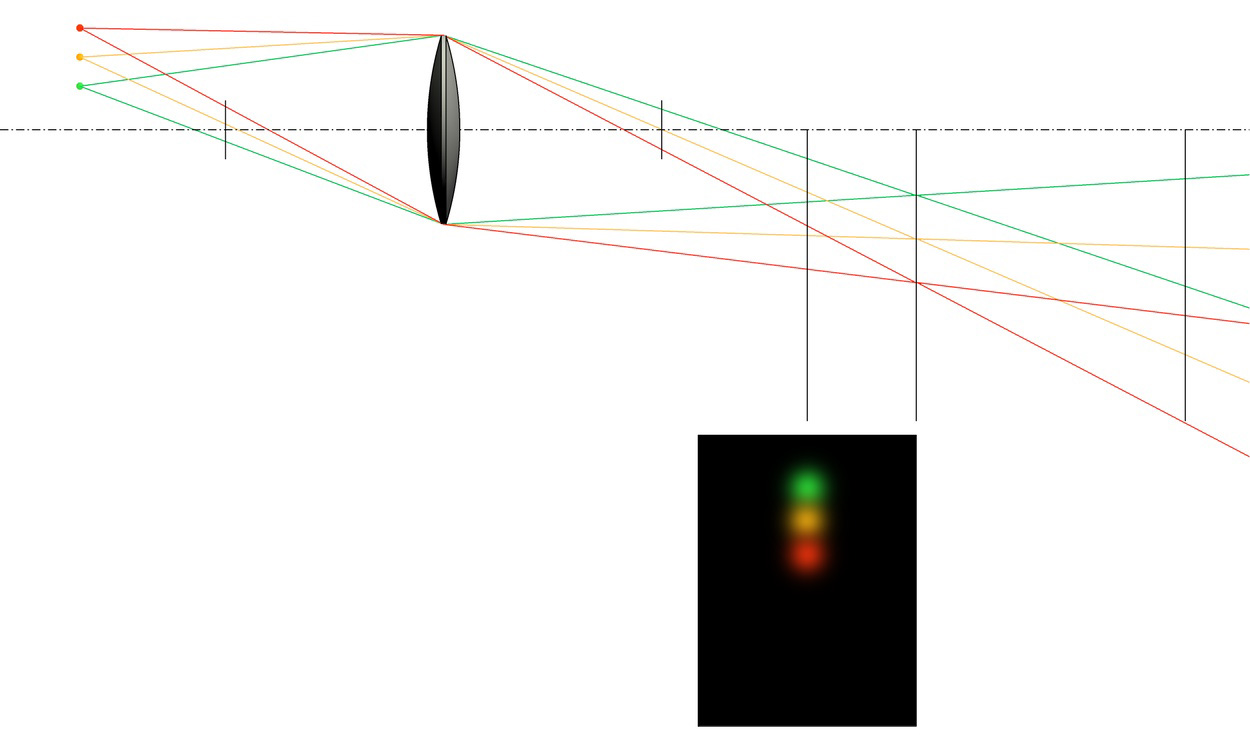 Steht der Schirm zu nahe an der Linse, so sind die Strahlenbündel noch nicht voll fokussiert. Das Ergebnis sind verwaschene Flecken.